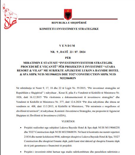 “Me anë të Vendimit të komitetit strategjik nr. 9, datë 23 Korrik 2024, Edi Rama miratoi në parim masa mbështetëse për vënie në dispozicion të pasurisë së paluajtshme shtetërore me sipërfaqe prej 76,950 m2, në ZK.2518, e zërit kadastral ‘ullishte’ dhe ‘pemtore’.