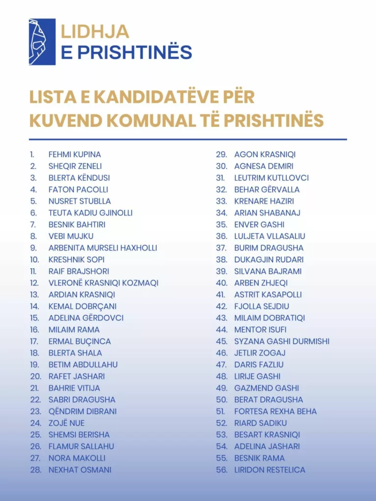 Kjo është lista fituese e Lidhjes së Prishtinës. Një listë përplot profesionalizëm, përvojë e shërbim ndaj komunitetit. Një listë ku mbizotëron uniteti dhe harmonia, me një renditje të realizuar përmes shortit për të siguruar trajtim të barabartë.