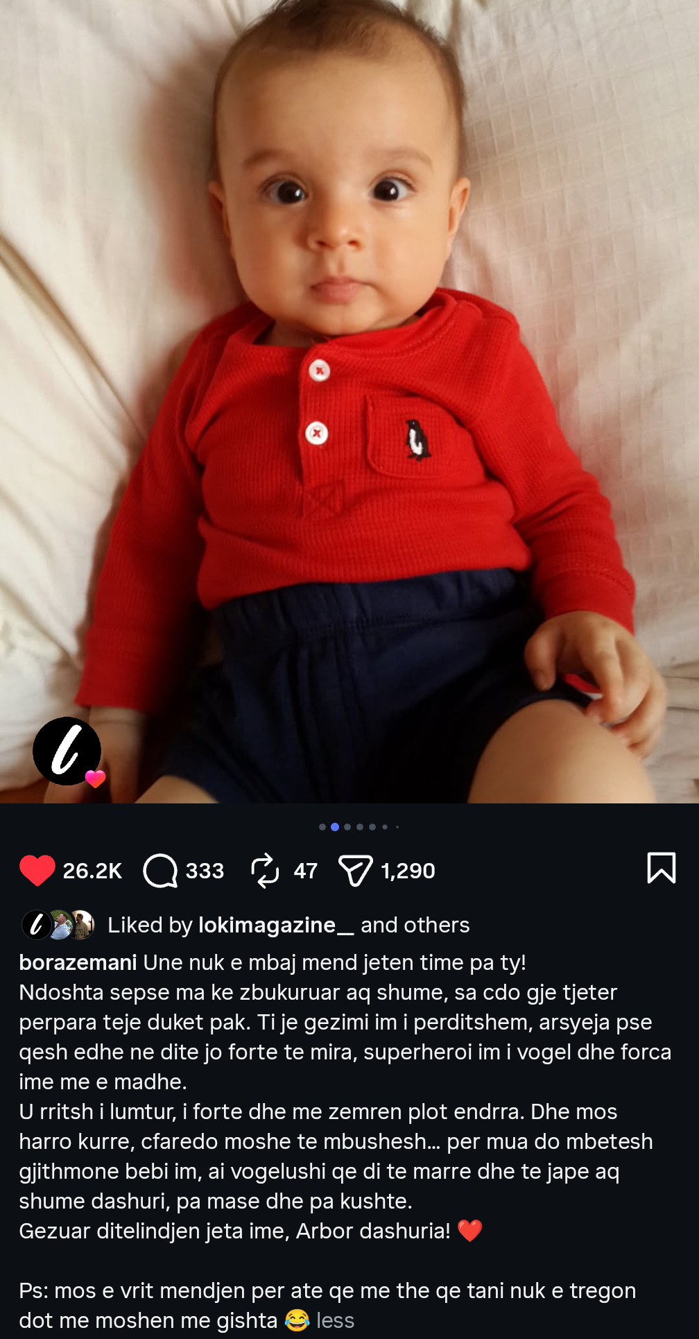 “U rritsh i lumtur, i fortë dhe me zemrën plot ëndrra. Dhe mos harro kurrë, çfarëdo moshe të mbushësh… për mua do mbetesh gjithmonë bebi im”, shkruan ajo, ndërsa e përshkruan Arborin si djalin që “jep dhe merr dashuri pa masë.”
