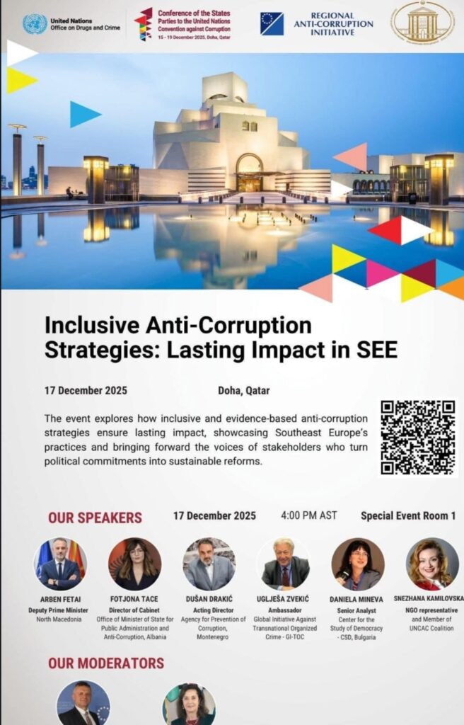 Në vazhdën e angazhimeve ndërkombëtare për forcimin e qeverisjes së mirë dhe luftën kundër korrupsionit, pas organizimit të suksesshëm në Shkup të forumit rajonal “Nga politika te impakti: avancimi i integritetit dhe reformave institucionale në Ballkanin Perëndimor”, sot ai udhëton drejt Dohës (Katar) për të pëfaqësuar vendin në Sesionin e 11-të të Konferencës së Shteteve Palë të Konventës së Kombeve të Bashkuara kundër Korrupsionit (CoSP11).