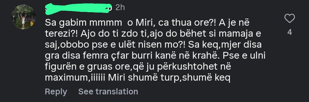 Reagimet kanë qenë të ashpra. Një ndjekëse shkruan e revoltuar: “Sa gabim o Miri, ça thua ore?! A je në terezi?!… Pse e ulni figurën e gruas ore, që ju përkushtohet në maksimum, iiiiii Miri shumë turp, shumë keq”.