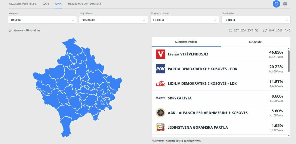 Sipas rezultateve të deritashme, Lëvizja Vetëvendosje ka siguruar 34,361 Vota. Pas VV-së, rënditet PDK-ja me 14,820 Vota.