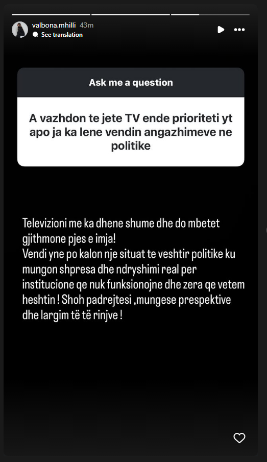 E pyetur nga ndjekësit nëse televizioni vazhdon të jetë prioriteti i saj apo i ka lënë vendin angazhimeve në politikë, Mhilli u shpreh se televizioni mbetet një pjesë e rëndësishme e identitetit të saj profesional përcjell Indeksonline.