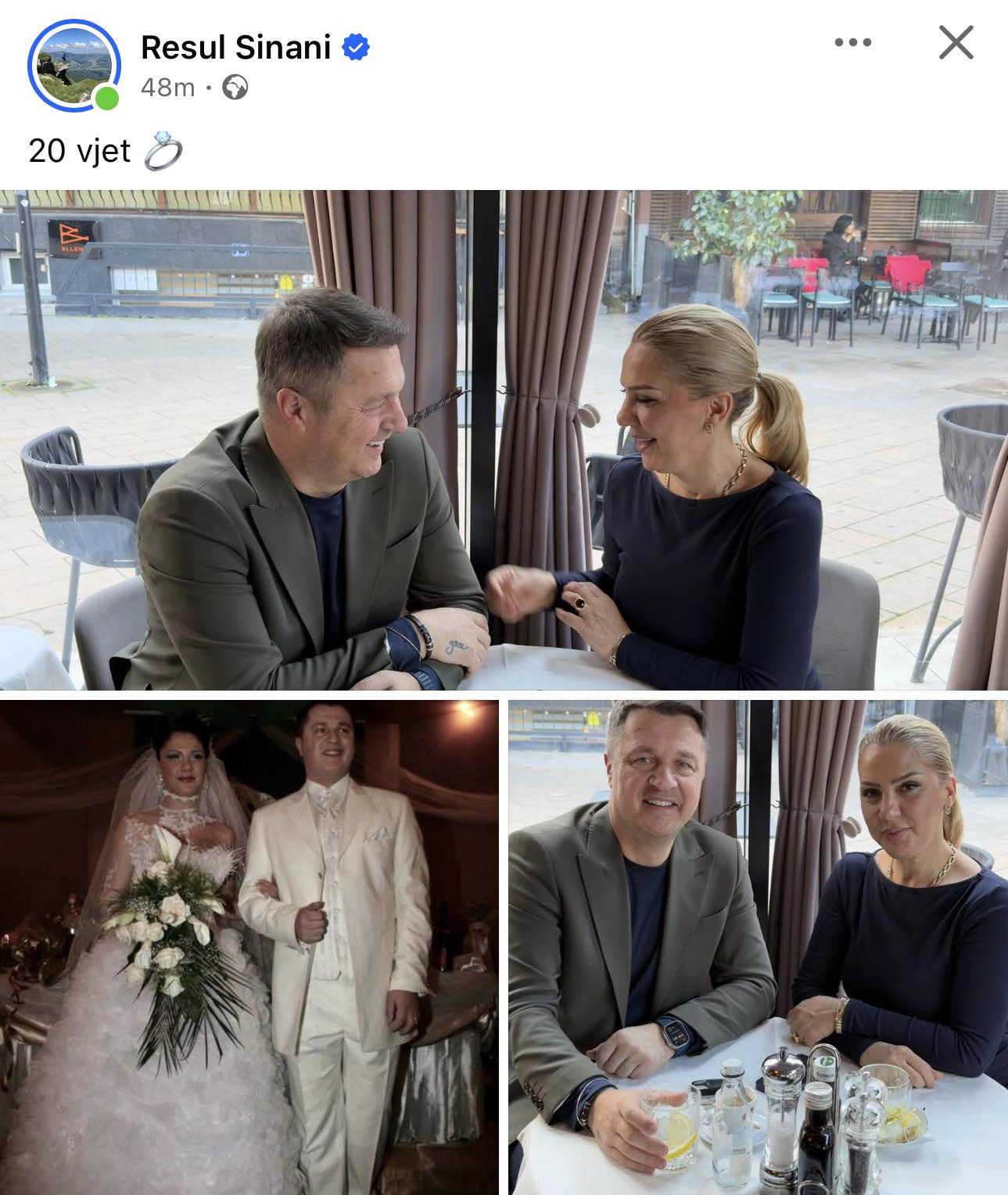 Moderatori Resul Sinani ka bërë të ditur përmes një postimi në Facebook se sot shënon 20-vjetorin e martesës.