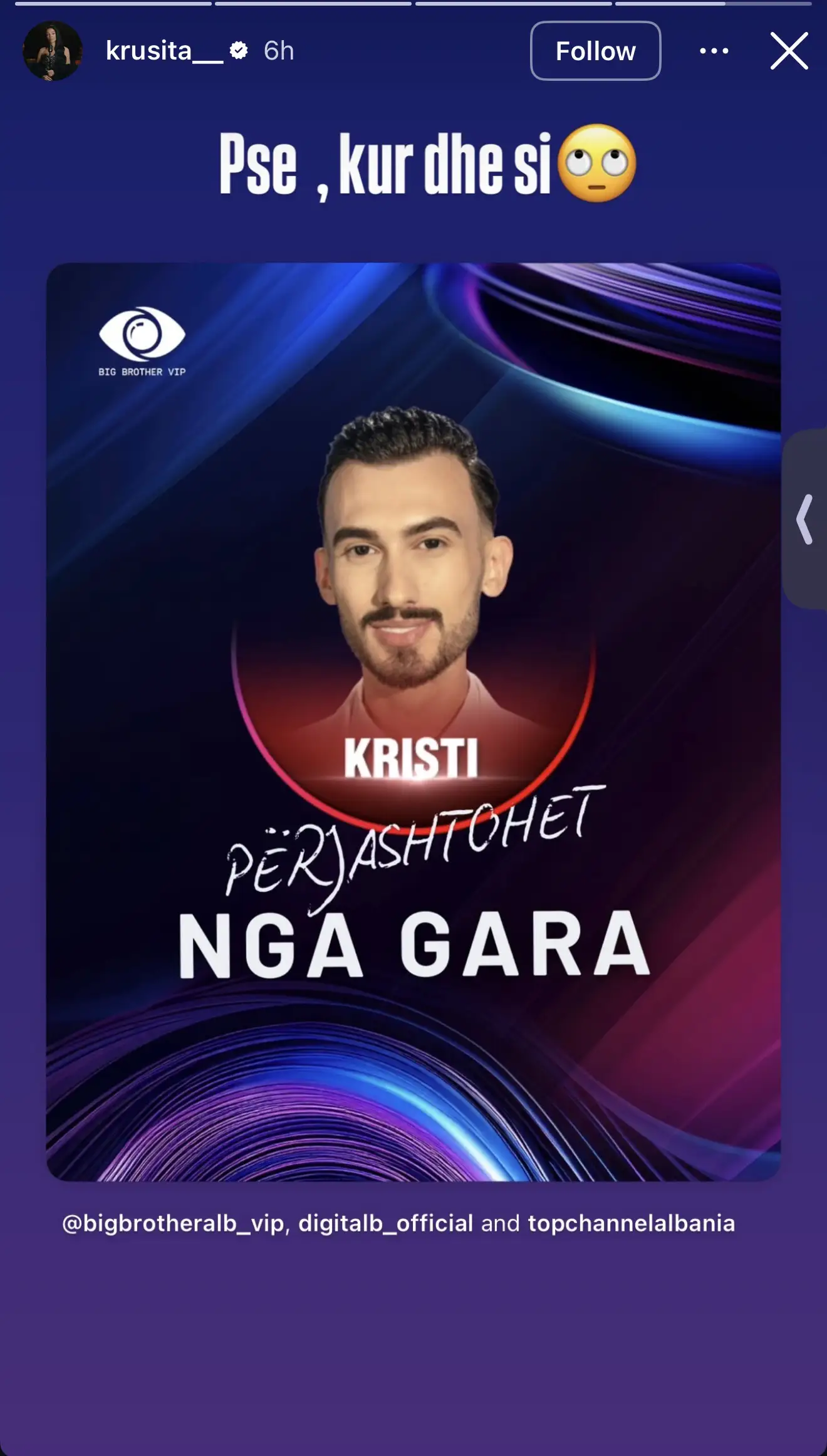 Pas përjashtimit të papritur të Kristi Lamajt nga “Big Brother VIP Albania”, reagimi i parë publik ka ardhur nga Krusita, me të cilën ai kishte krijuar një lidhje të ngushtë brenda shtëpisë. Përmes një postimi në rrjetet sociale, ajo ka shprehur hapur habinë e saj, duke shkruar thjesht: “Pse, kur dhe si”.