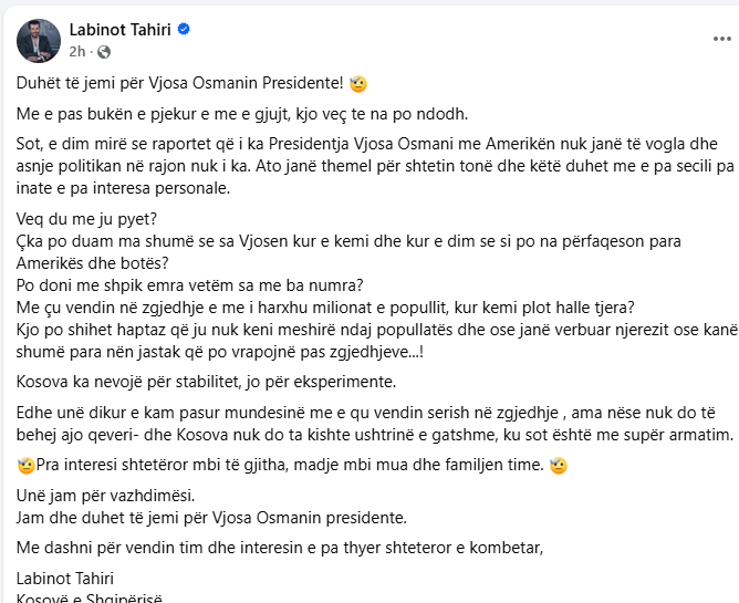 Këngëtari dhe ish-deputeti i Kuvendit të Kosovës, Labinot Tahiri, ka shprehur publikisht mbështetjen e tij për vazhdimësinë e mandatit të Presidentes Vjosa Osmani, duke theksuar se vendi ka nevojë për stabilitet politik dhe jo për zgjedhje të reja.