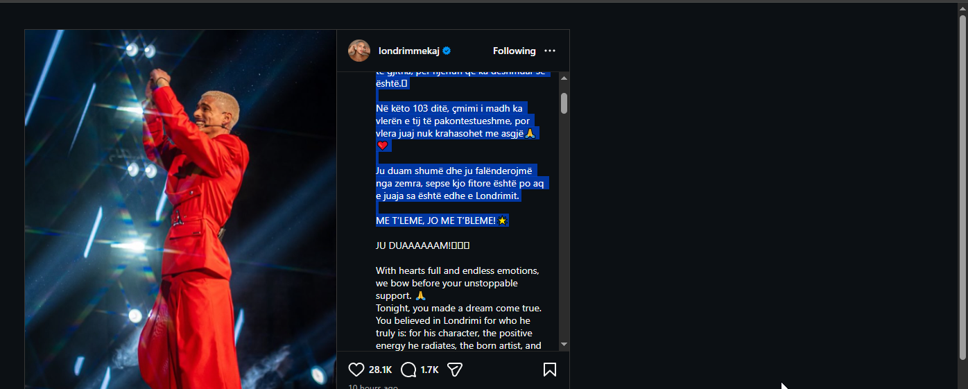 “Me zemër plot dhe emocione pa fund, përulemi para mbështetjes suaj të pandalshme. Sonte, ju bëtë realitet një ëndërr. Besuat te Londrimi për atë që është: për karakterin që ka, për energjinë pozitive që përcjell, për artistin e lindur dhe, mbi të gjitha, për njeriun që ka dëshmuar se është,” – shkroi ai.