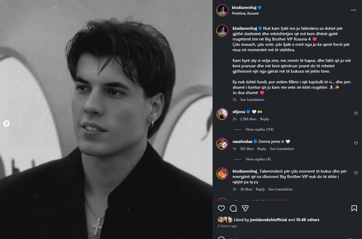 Pas përfundimit të rrugëtimit të tij në “Big Brother VIP Kosova 4”, Klodian Mihaj ka reaguar me një mesazh prekës në rrjetet sociale, duke falënderuar publikun për mbështetjen e vazhdueshme.