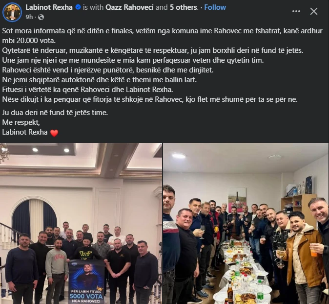 Përmes një postimi në rrjetin social Facebook, ai thekson se vetëm në finale kanë qenë 20 mijë vota nga Rahoveci.