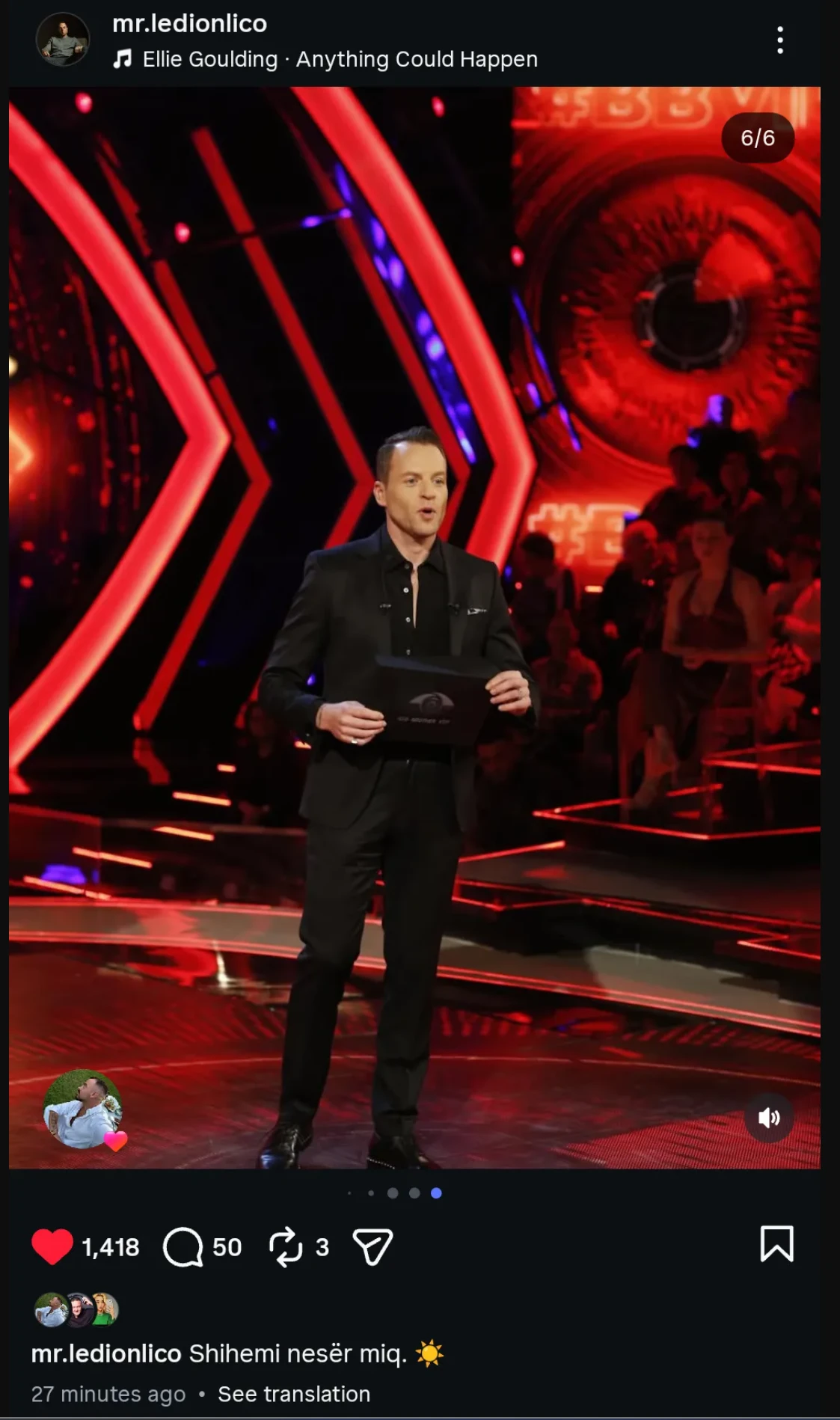 Për t’i shtuar edhe më shumë dozat e misterit dhe tensionit, Ledioni ka zgjedhur një kolonë zanore mjaft domethënëse për postimin e tij: këngën “Anything Could Happen” (Çdo gjë mund të ndodhë) nga Ellie Goulding.