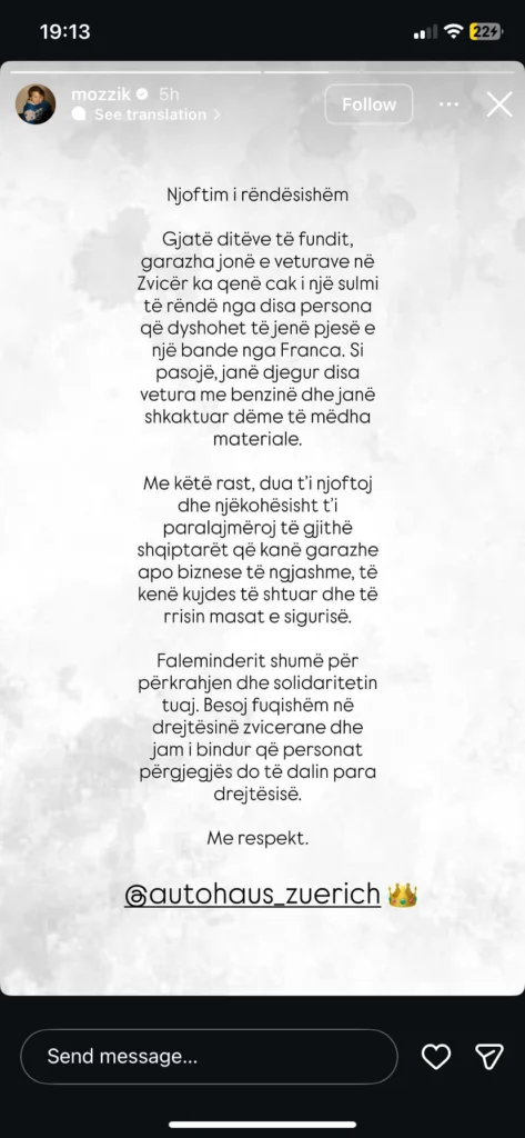 Reperi Mozzik ka bërë të ditur se biznesi i tij ka qenë cak i një sulmi, për të cilin thotë se është kryer nga një grup personash që i ka cilësuar si “bandë nga Franca”.
