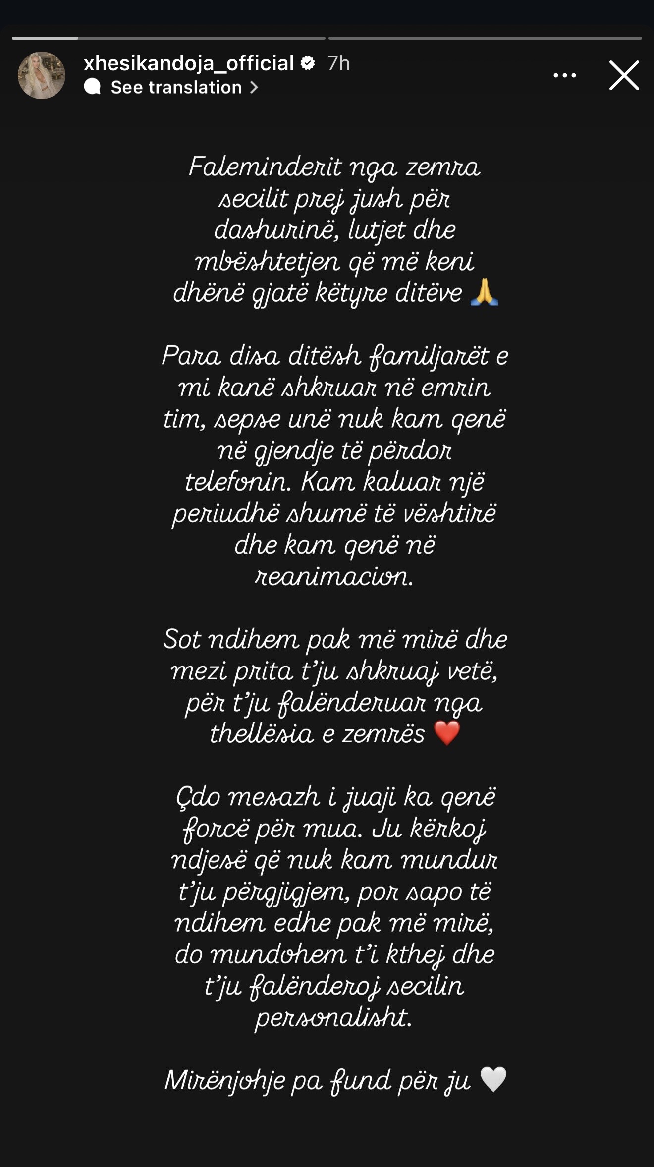Ndonëse situata ka qenë e rëndë, Xhesika dha shpresë duke thënë se sot ndihet pak më mirë dhe gjeti forcën për t’i falënderuar të gjithë për mbështetjen dhe lutjet e shumta që ka marrë gjatë këtyre ditëve.