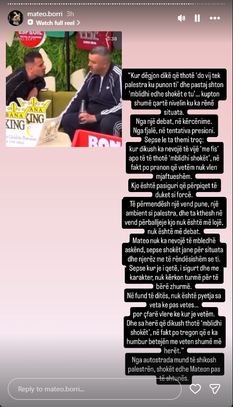 “Kur dikush ka nevojë të vijë ‘me fis’ apo të të thotë ‘mblidhi shokët’, në fakt po pranon që vetëm nuk vlen mjaftueshëm. Kjo është pasiguri që përpiqet të duket si forcë… Mateo nuk ka nevojë të mbledhë askënd, sepse shokët janë për situata dhe njerëz më të rëndësishëm se ti. Sepse kur je i qetë, i sigurt dhe me karakter, nuk kërkon turmë për të bërë zhurmë.”
