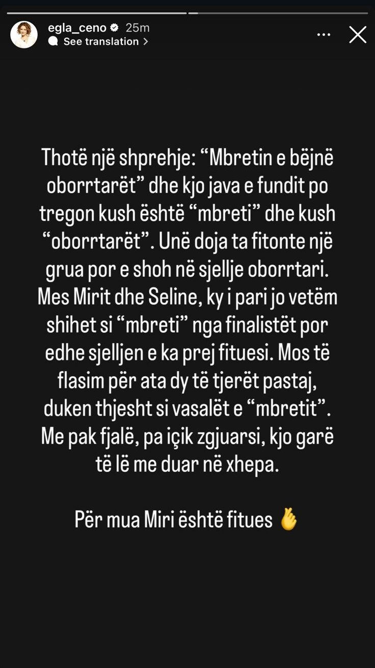 Duke u ndalur tek favoritët, Egla ka bërë një krahasim të drejtpërdrejtë mes Mirit dhe Selines. Për të, zgjedhja është e qartë. Sipas aktores, Miri jo vetëm që trajtohet dhe shihet si “mbret” nga vetë finalistët e tjerë, por ai reflekton tërësisht sjelljen dhe formatin e një fituesi të vërtetë, duke e merituar plotësisht këtë epitet.