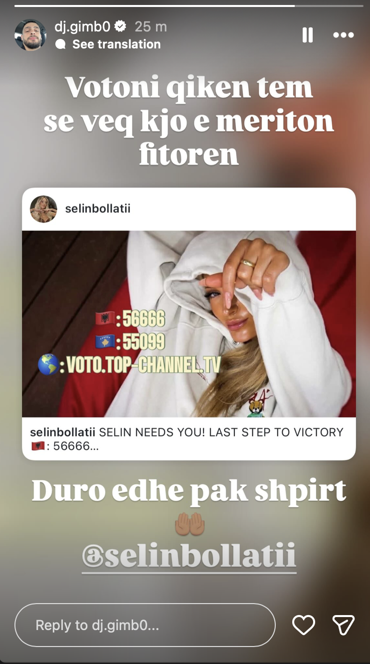 Përveç thirrjes për votë, DJ Gimbo ka ndarë edhe një mesazh emocional për Selin, duke i dhënë kurajo në momentet e fundit të garës. “Duro edhe pak shpirt”, ka shtuar ai, duke e etiketuar atë në postim.