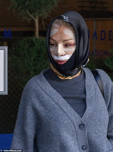 48-vjeçarja u fotografua duke dalë nga një klinikë në Stamboll, ndërsa mbante fytyrën të mbuluar me shall të zi dhe me fasha në hundë, buzë dhe ballë, duke treguar pasojat e operacionit estetik që kishte kryer.